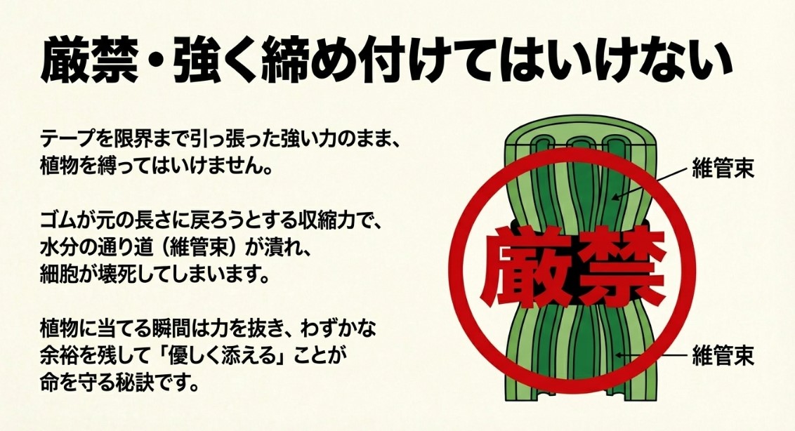 確かにテープを活性化させるためには引っ張る動作が必須なのですが、その「強く引っ張ってピンピンに張った状態のまま」、力任せに植物の柔らかい組織をギュッと縛り上げてしまうのは絶対にNGです。