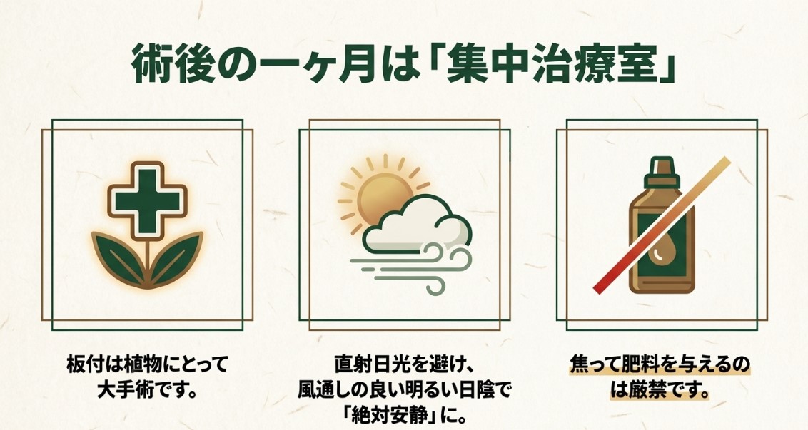 術後の約1ヶ月間は「養生期間」と明確に割り切り、直射日光の当たらない風通しの良い明るい日陰に置いて「絶対安静」にさせてあげてください。