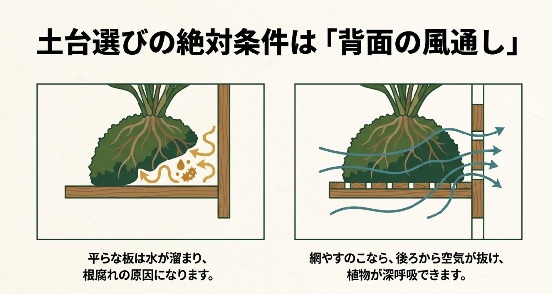 背面の風通しを確保することが、根腐れを防ぐための土台選びの絶対条件になります 。