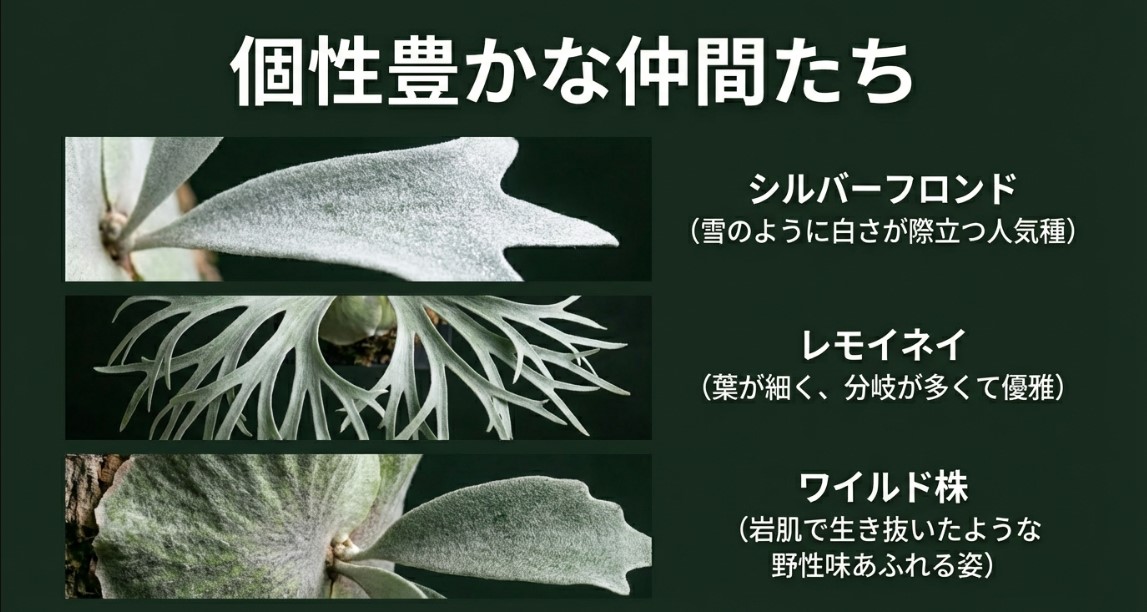 - シルバーフロンド(Silver frond):通常のビーチー(基本種)よりもさらに星状毛の密度が異常に濃く、まるで雪を被ったかのような圧倒的な白銀色の葉を展開する、非常に観賞価値が高く大人気の選抜品種です。光に当たるとキラキラとメタリックに輝く姿は、まさに芸術品です。